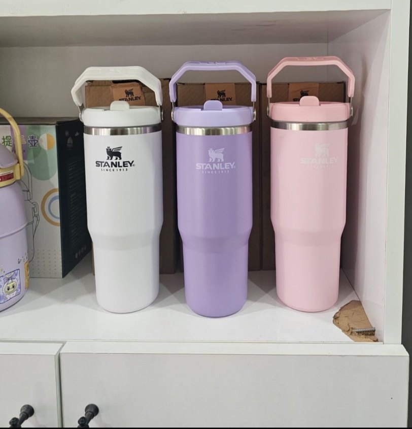 Stanley markalı, pastel pembe renkte, sağlam saplı ve paslanmaz çelik gövdeli çocuk termos şişesi. İçecekleri sıcak veya soğuk tutar.