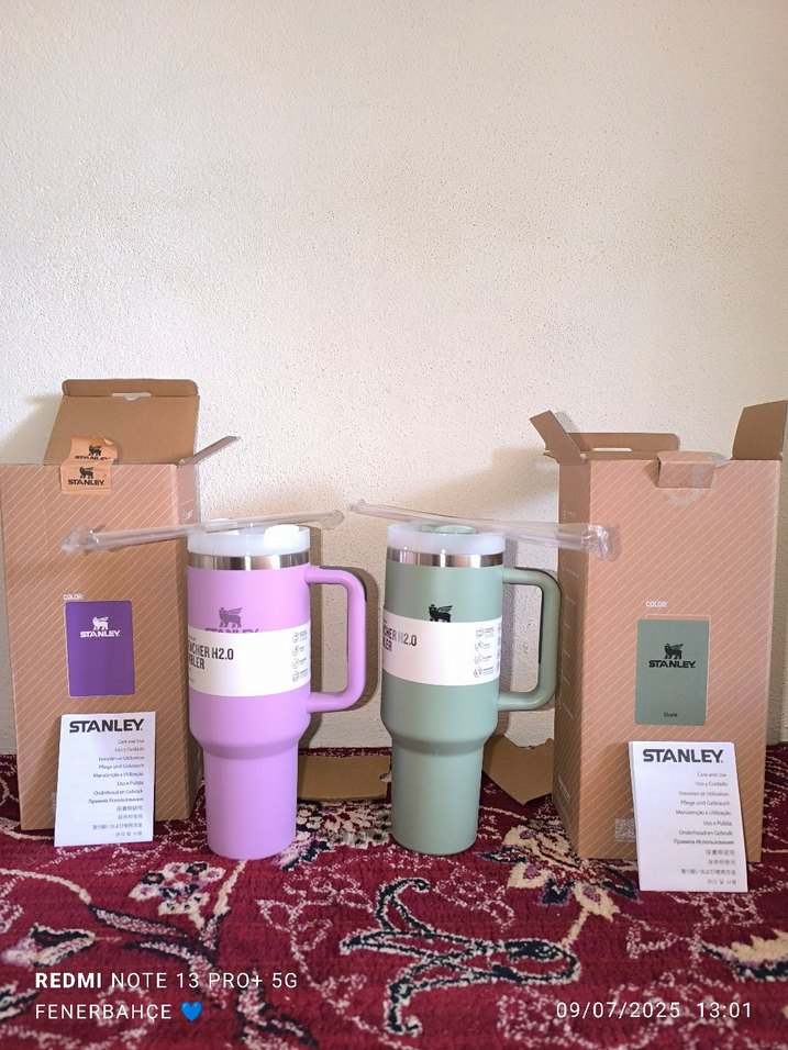 Stanley markalı, pastel mor ve yeşil renklerde, kapaklı ve saplı termos bardak. Sıcak ve soğuk içecekler için dayanıklı tasarım.