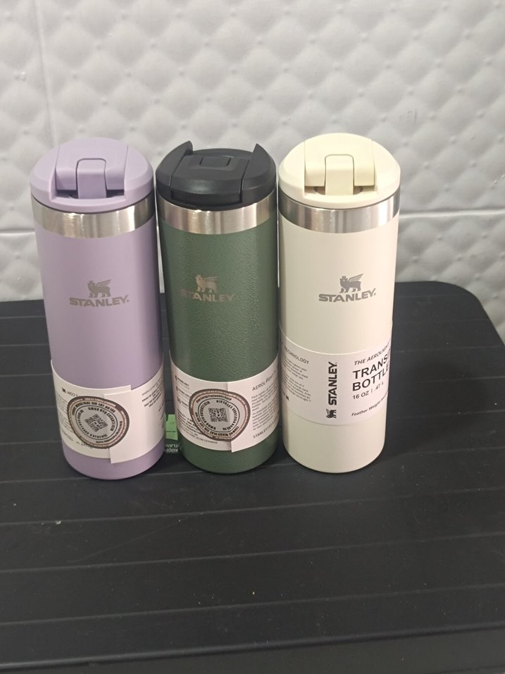 Stanley marka beyaz, lavanta ve yeşil pastel renklerde, içecekleri sıcak veya soğuk tutan kapaklı termos şişeler.