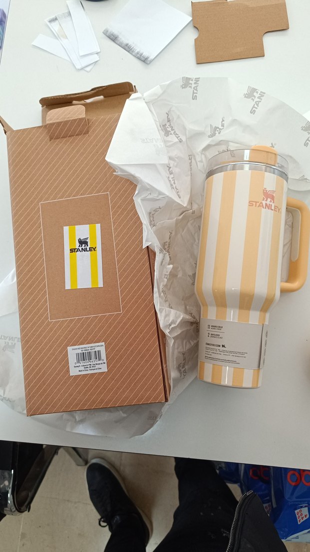 Stanley markalı, pastel sarı renkte, çizgili tasarıma sahip termosu. Kolay taşıma için kulplu ve içecekleri sıcak tutar.