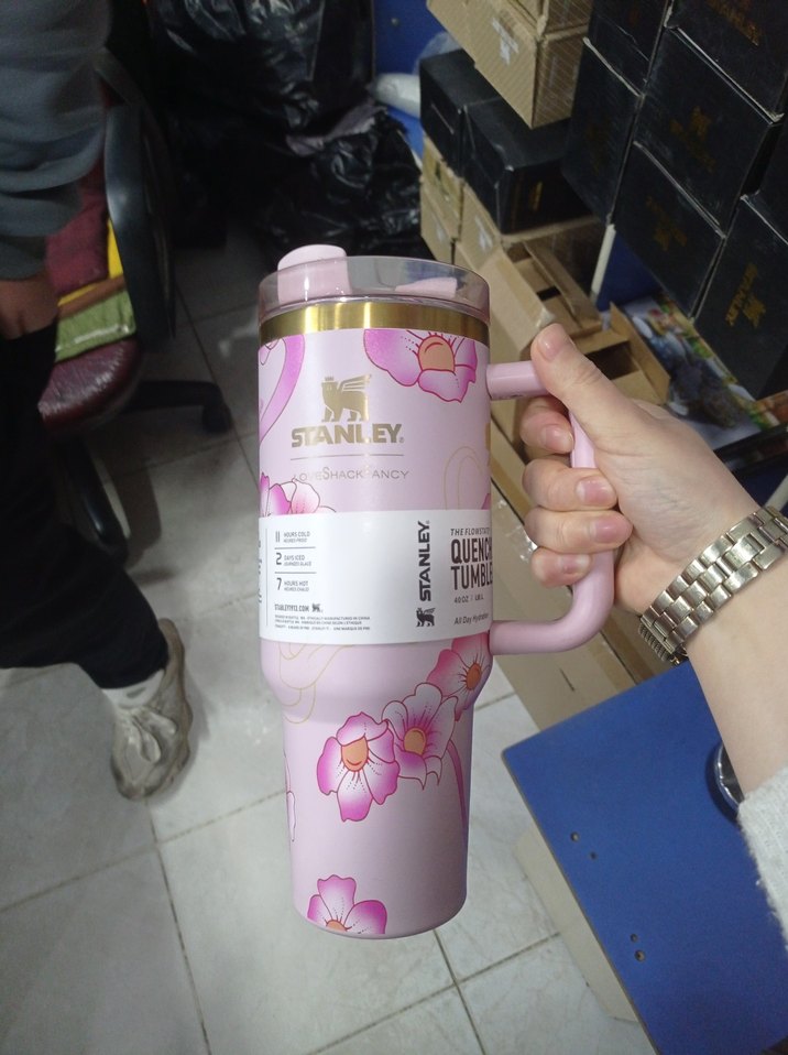 Pastel pembe renkte, çiçek desenli ve saplı Stanley termos. İçecekleri sıcak tutar, çocuklar için kullanışlıdır. 1.18 litre