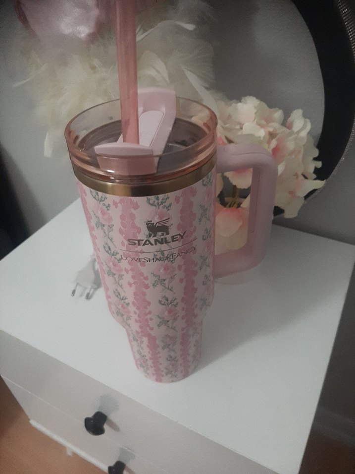 Stanley marka pembe çiçek desenli termos bardak, kulplu ve pipetli tasarımıyla içeceklerinizi sıcak veya soğuk tutar.
