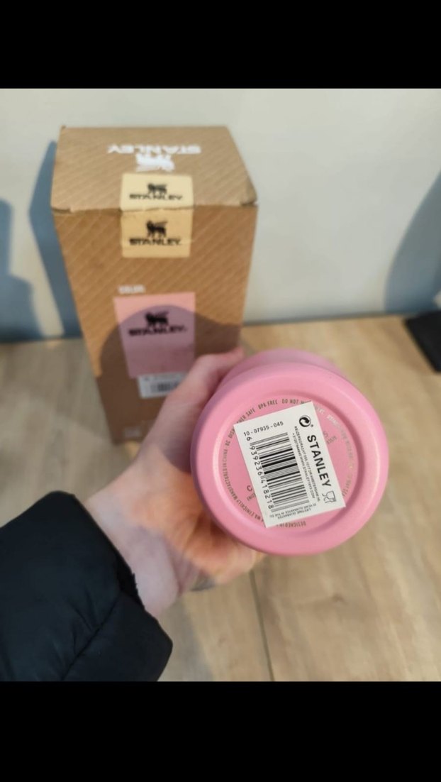 Stanley marka pembe çocuk termos şişesi, pastel renkte olup içecekleri sıcak veya soğuk tutar.