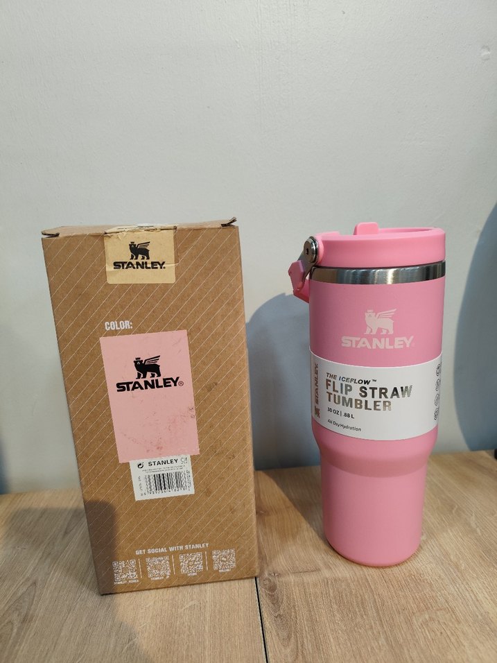 Stanley markalı pembe termos matara, flip pipetli ve içeceklerin sıcak veya soğuk kalmasını sağlar. Güvenli kapaklı ve pastel renklidir.