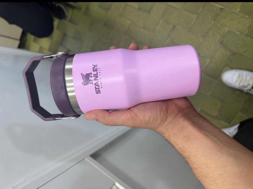 Stanley markalı pastel pembe termos şişe, içecekleri sıcak veya soğuk tutan dayanıklı izolasyona sahiptir. Küçük eller için uygun boyuttadır.