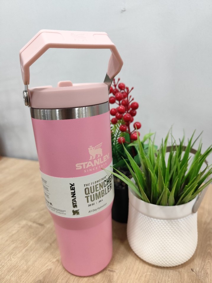 Stanley marka pembe termos şişe, pastel renkte ve taşıması kolay sağlam bir tutacağa sahip. İçecekleri uzun süre sıcak veya soğuk tutar.