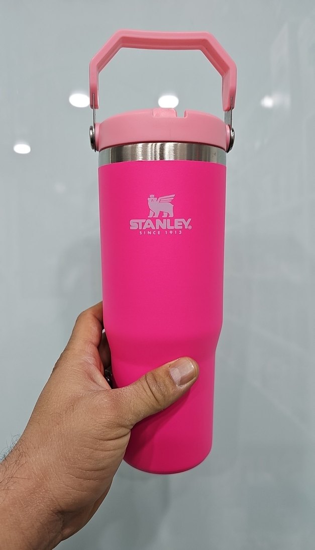 Stanley pembe çocuk termos şişesi, dayanıklı sap ve paslanmaz çelik detaylar içerir. Sıvıları uzun süre sıcak veya soğuk tutar.