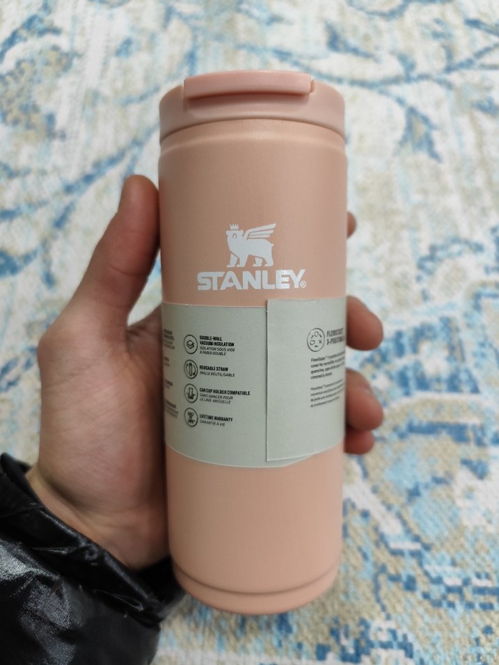 Stanley pembe renkli çocuk termos şişesi, içecekleri sıcak veya soğuk tutan güvenilir izolasyona sahiptir. Güvenli kapaklı ve kompakt boyuttadır.