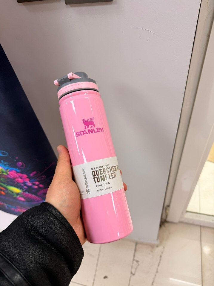 Pastel pembe renkte Stanley termos şişesi, dayanıklı yapısı ve güvenli kapağıyla içeceklerin sıcak veya soğuk kalmasını sağlar.