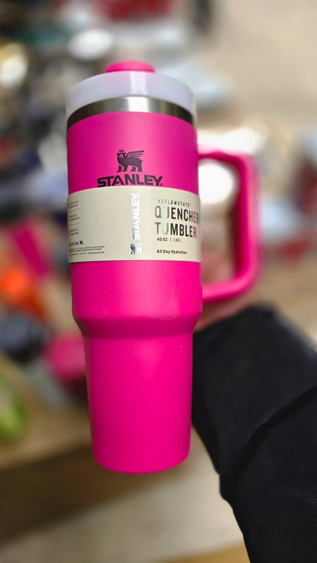 Renkli pembe Stanley Qjenche termos, saplı ve içecekleri sıcak veya soğuk tutar. 1.18 litre kapasitelidir, tüm gün su içmek için uygundur.