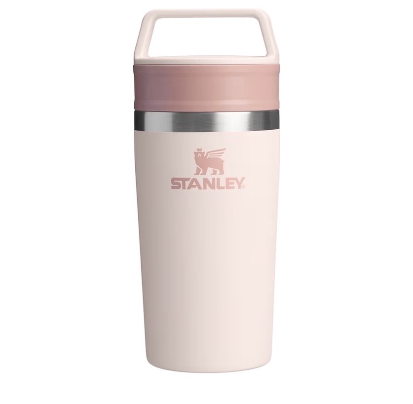 Stanley marka pastel pembe çocuk termosu, kullanışlı kulp ve dayanıklı yapıya sahiptir, içecekleri sıcak tutar.