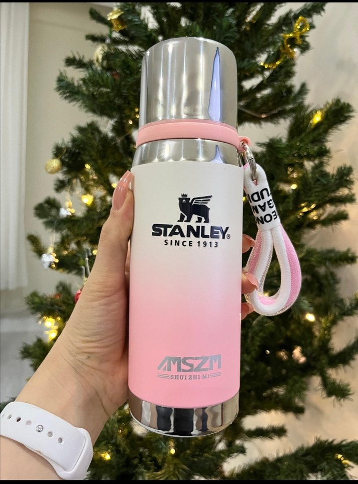 Stanley markalı, paslanmaz çelikten yapılmış, pastel pembe çocuk termosu. Kapaklı ve taşıma kayışlı, içecekleri sıcak tutar.