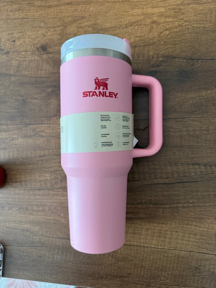 Stanley marka pastel pembe renkli çocuk termosu, taşıma sapıyla kolay kullanım sağlar. İçecekleri sıcak veya soğuk tutar.
