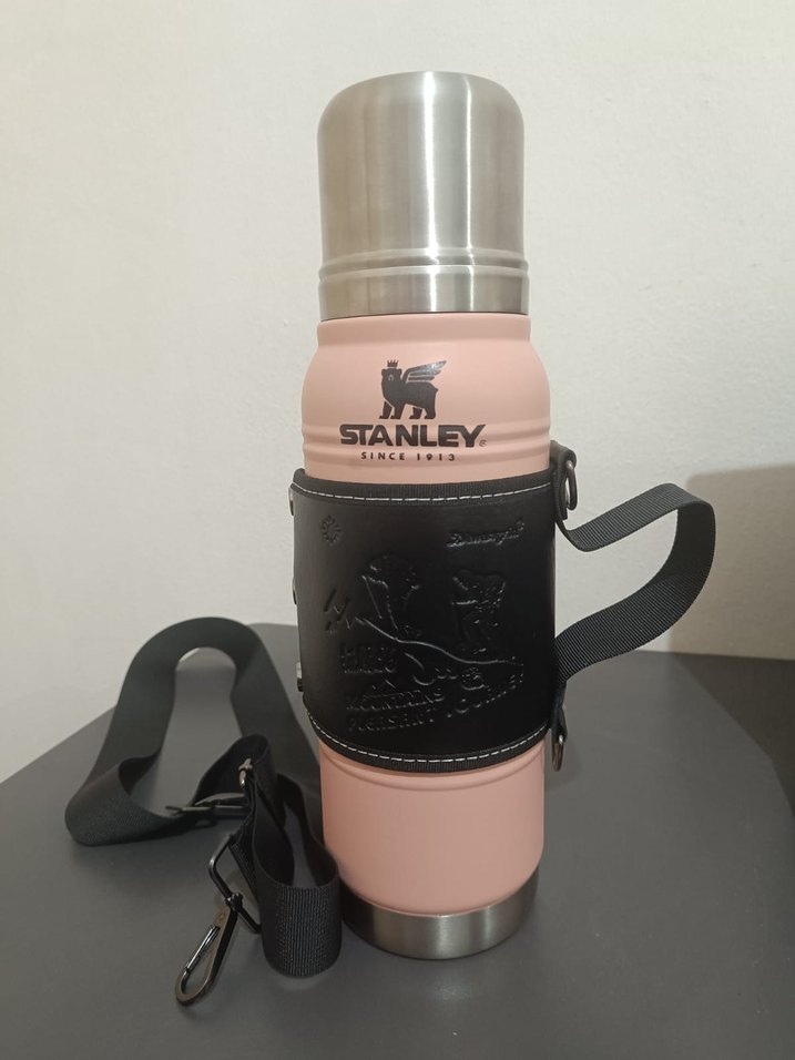 Stanley pembe çocuk termosu, pastel renkte ve çıkarılabilir siyah taşıma kayışı ile kolay taşınır. İçecekleri saatlerce sıcak tutar.