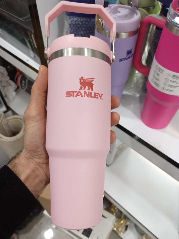 Pastel pembe renkte Stanley çocuk termosu, taşıma kolu ve güvenli kapak ile içecekleri sıcak veya soğuk tutar.
