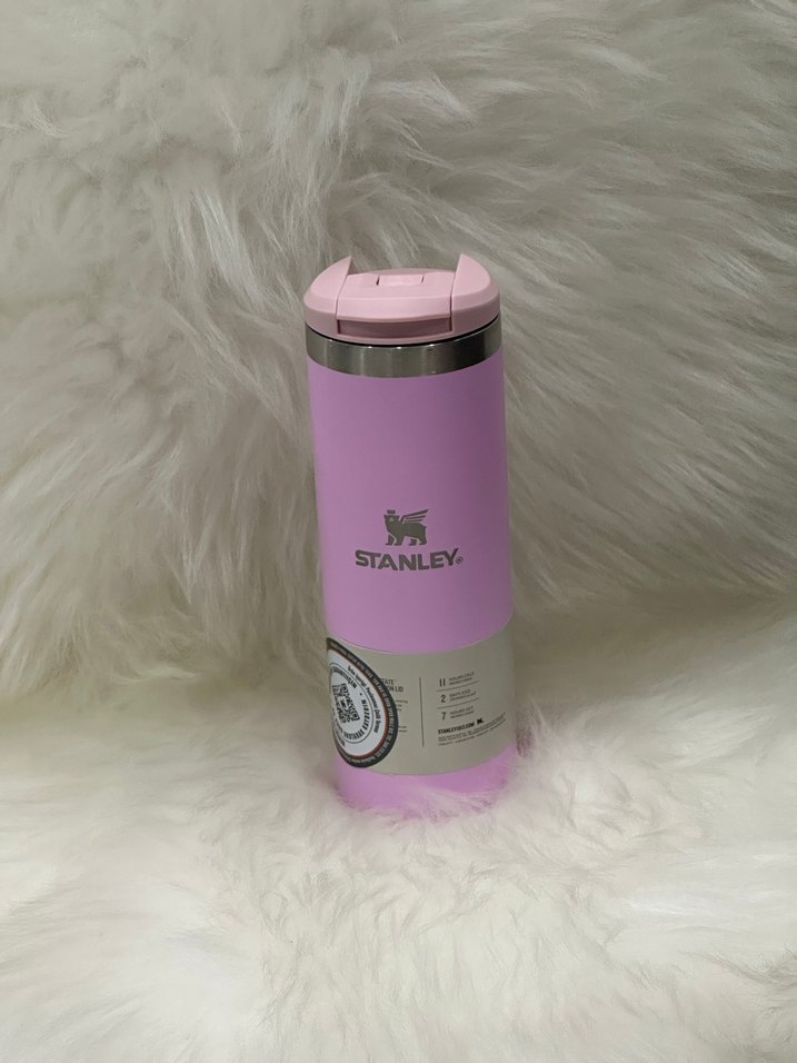 Stanley markalı pastel pembe renkli çocuk termosu, dayanıklı paslanmaz çelik gövde ve güvenli kapak ile içecekleri sıcak veya soğuk tutar.
