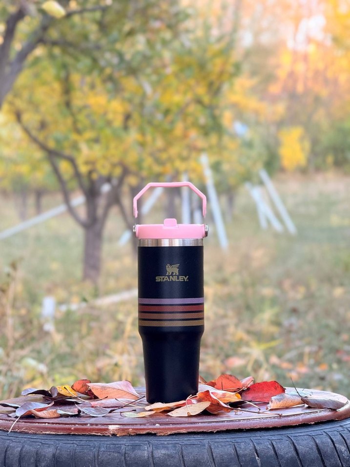 Stanley markalı bu çocuk termosu koyu renk gövde ve pembe kapak ile taşınabilir ve içecekleri sıcak tutar.