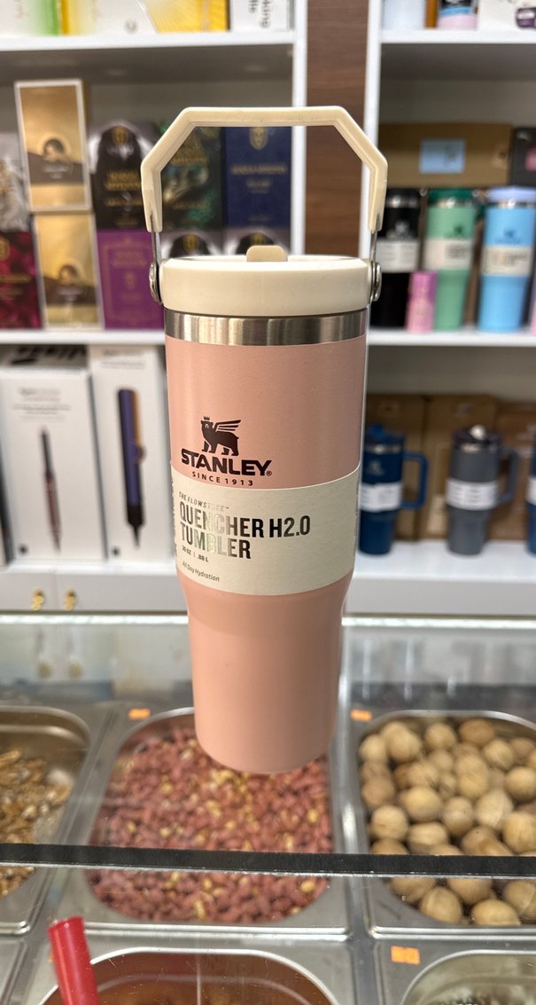 Stanley pembe pastel termos matara, dayanıklı tasarımı, güvenli kapak ve kolay taşıma için sap içerir. Sıcak veya soğuk içecekleri uzun süre korur.