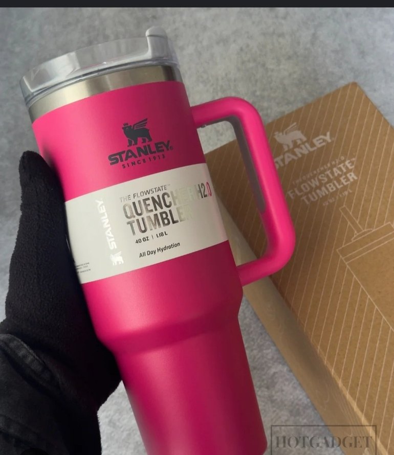 Stanley Quench Tumbler, 40 oz kapasiteye sahip pembe renkli, içecekleri sıcak veya soğuk tutan izolasyonlu termos bardaktır. Dayanıklı sapı ve dökülmeye karşı kapaklıdır. orjinal yurdışı ürünüdür. 11 saat soğuk 2 gün buz 7 saat sıcak tutuyor. 1.18 L