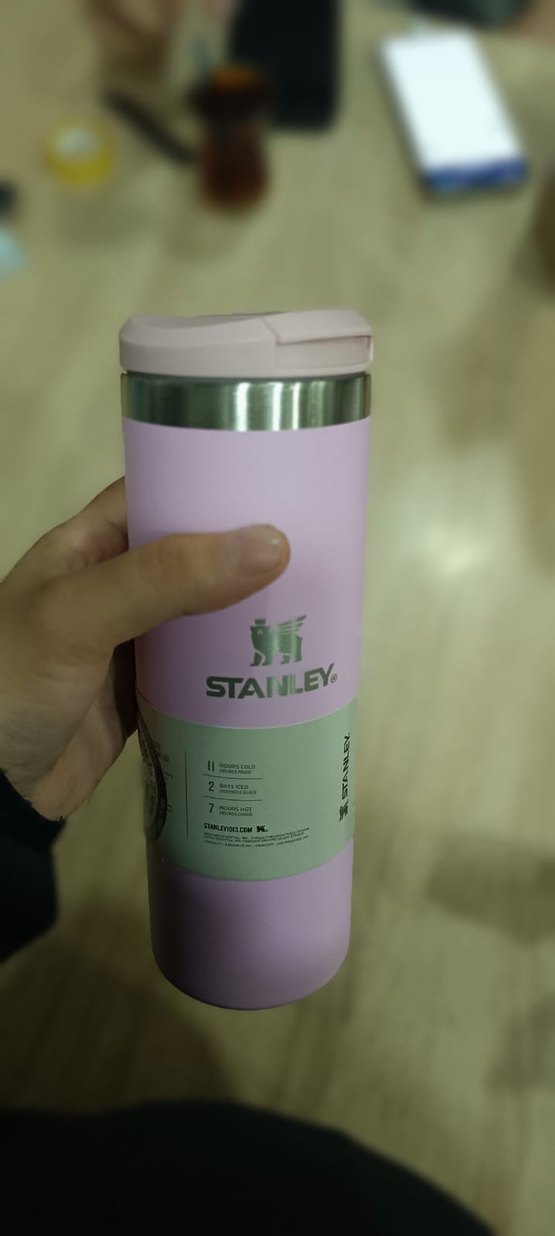 Stanley markalı pastel pembe çocuk termosu, içecekleri saatlerce sıcak veya soğuk tutar. Güvenli kapak ve kompakt tasarıma sahiptir.