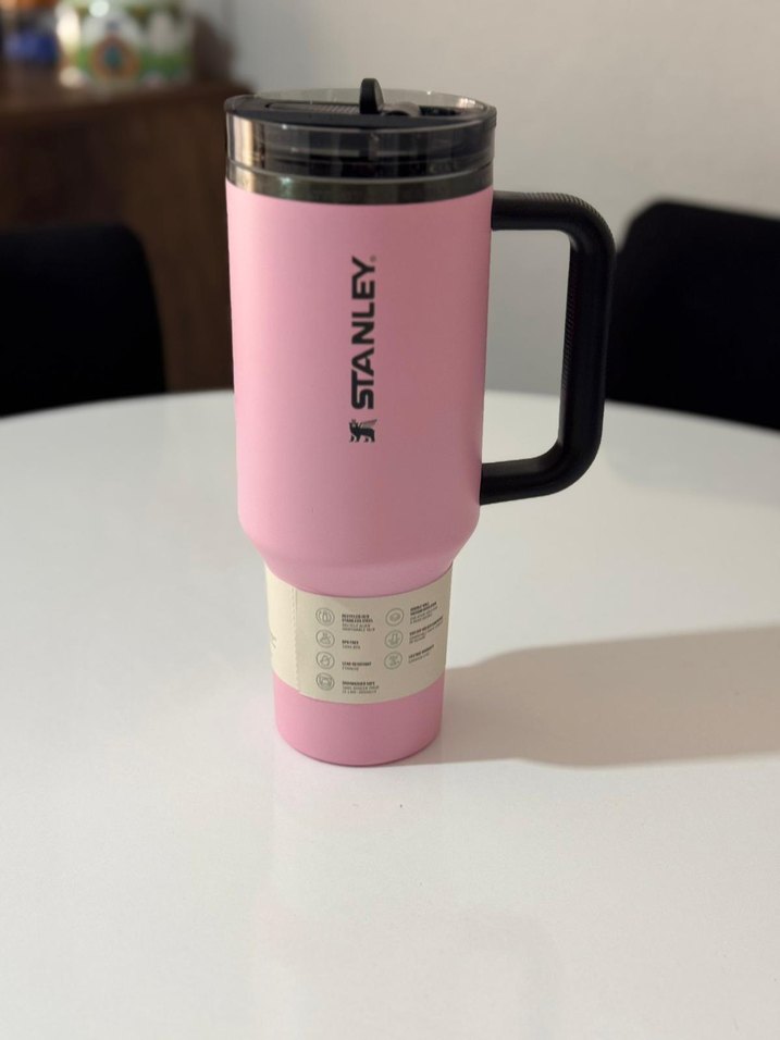 Stanley pembe termos bardak, pastel renkte ve siyah saplıdır. Dökülmeyi önleyen kapaklı, içecekleri sıcak veya soğuk tutar. ☕️instagram @ghoncashop.com