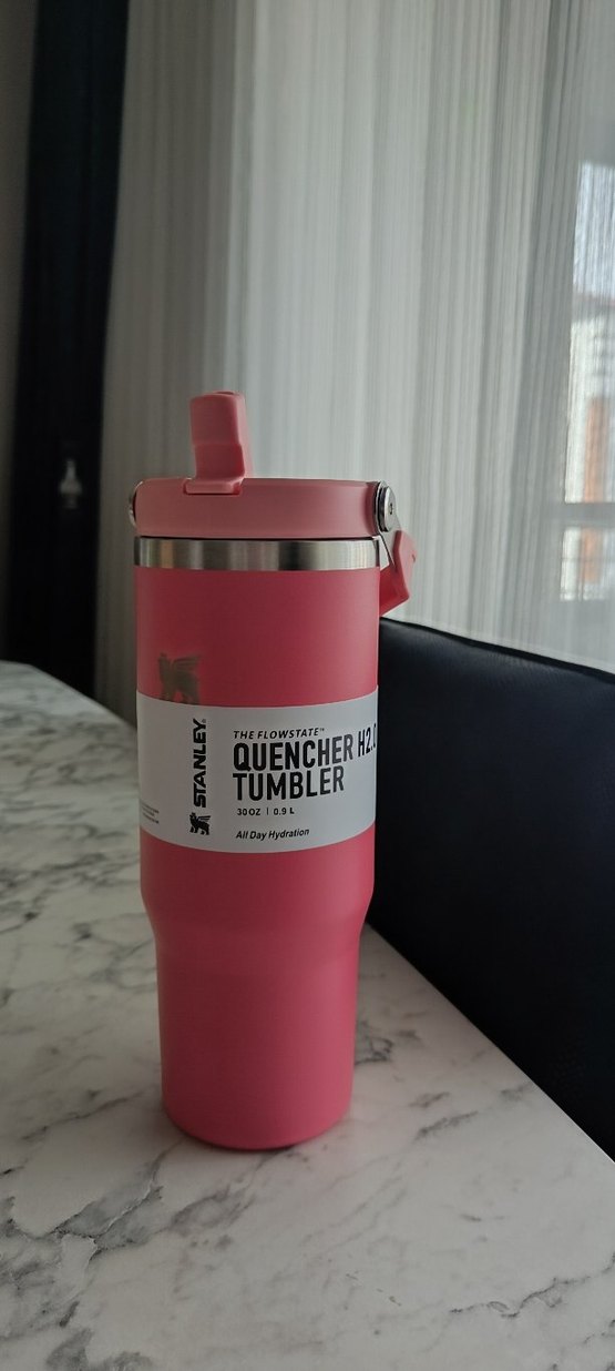 Stanley pembe renkli, 0.9 litre kapasiteli termos matara. Güvenli kapak ve taşıma sapı bulunur.