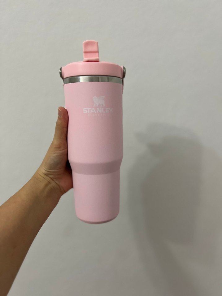 Pastel pembe renkte Stanley termos, içecekleri uzun süre sıcak veya soğuk tutar. Kolay içim için açılır kapaklıdır.