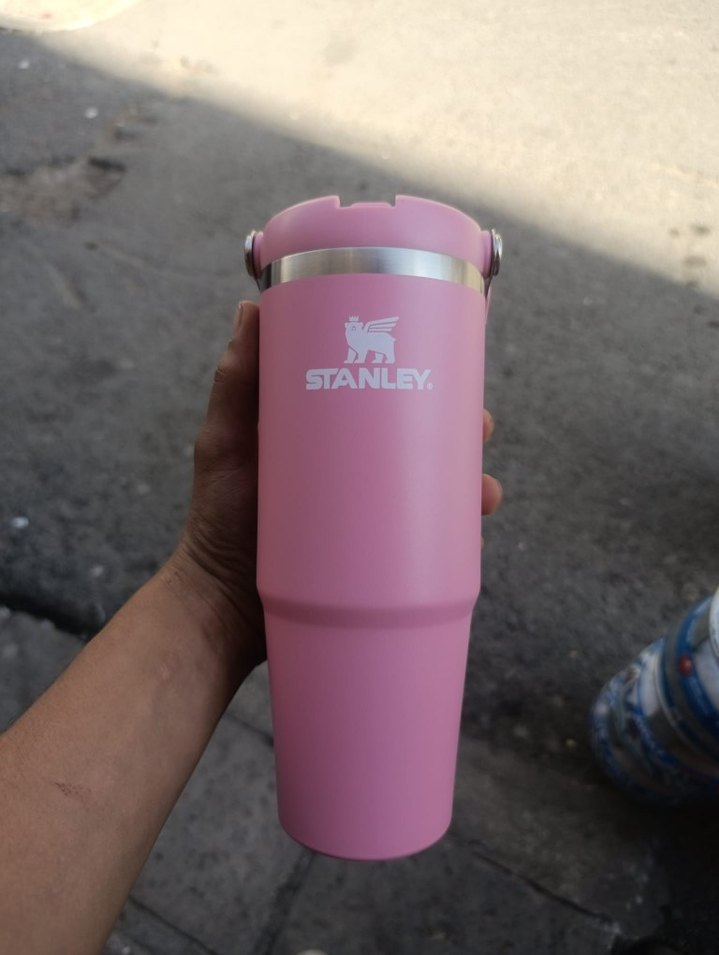 Stanley markalı pastel pembe renkli termos matara, içecekleri uzun süre sıcak veya soğuk tutar. Çocuklar için uygundur.