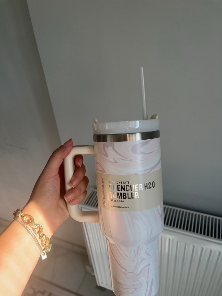 Saplı ve pipetli beyaz termoslu bardak, mermer desenli ve "ENCHER H2.0" yazılıdır. Kutulu sıfır