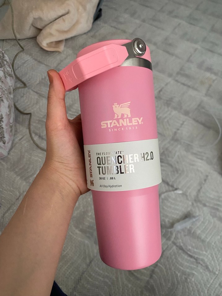 Stanley Quencher H2.0 çocuk termosu pastel pembe renkte, güvenli kapaklı ve gün boyu içeceklerinizi taze tutar.