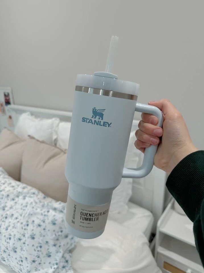 Stanley Quencher Tumbler, beyaz ve gri renkte, saplı ve pipetli kolay içim sağlar.