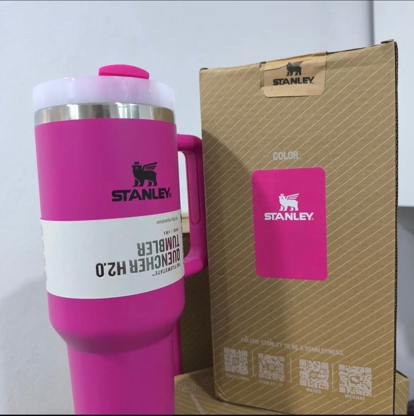 Stanley markalı, renkli pembe termos şişesi, içecekleri sıcak tutmak için tasarlanmıştır. Saplı ve güvenli kapaklıdır.