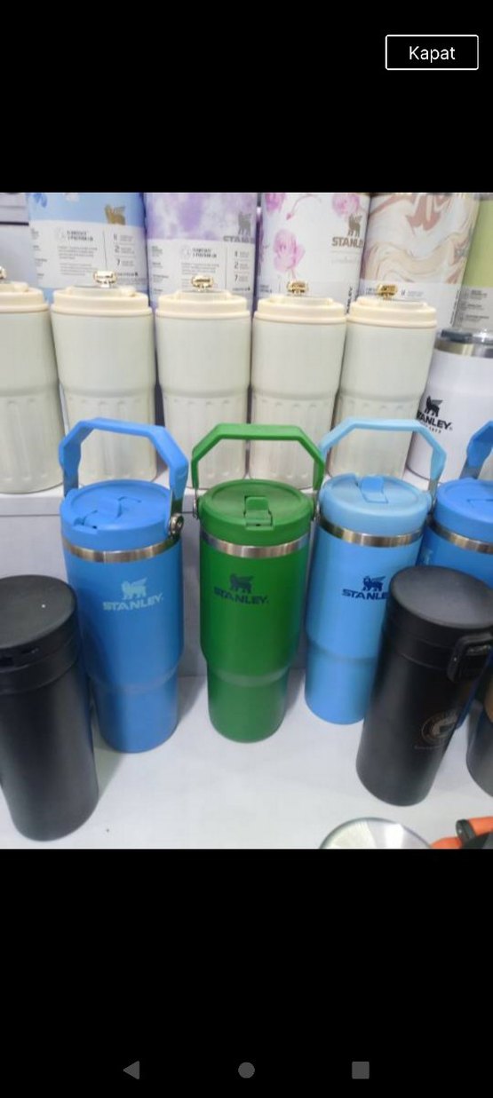 Stanley markalı, sağlam saplı ve kapaklı renkli seyahat termosu, içecekleri sıcak veya soğuk tutmak için uygundur. Mavi ve yeşil renk seçenekleriyle. ☕
