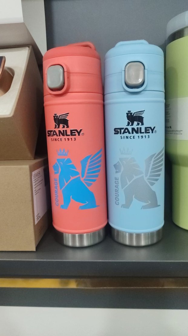 Stanley renkli termos şişesi, güvenli basmalı kapak ve dayanıklı izolasyon ile içecekleri sıcak veya soğuk tutar.