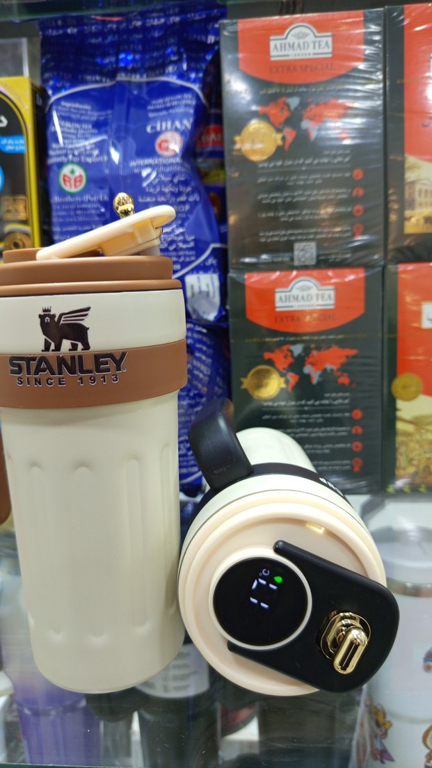 Stanley markalı, beyaz gövdeli ve kahverengi tutacaklı renkli çocuk termos şişesi. Kapakta dijital sıcaklık göstergesi bulunur. İçecekleri sıcak veya soğuk tutar.