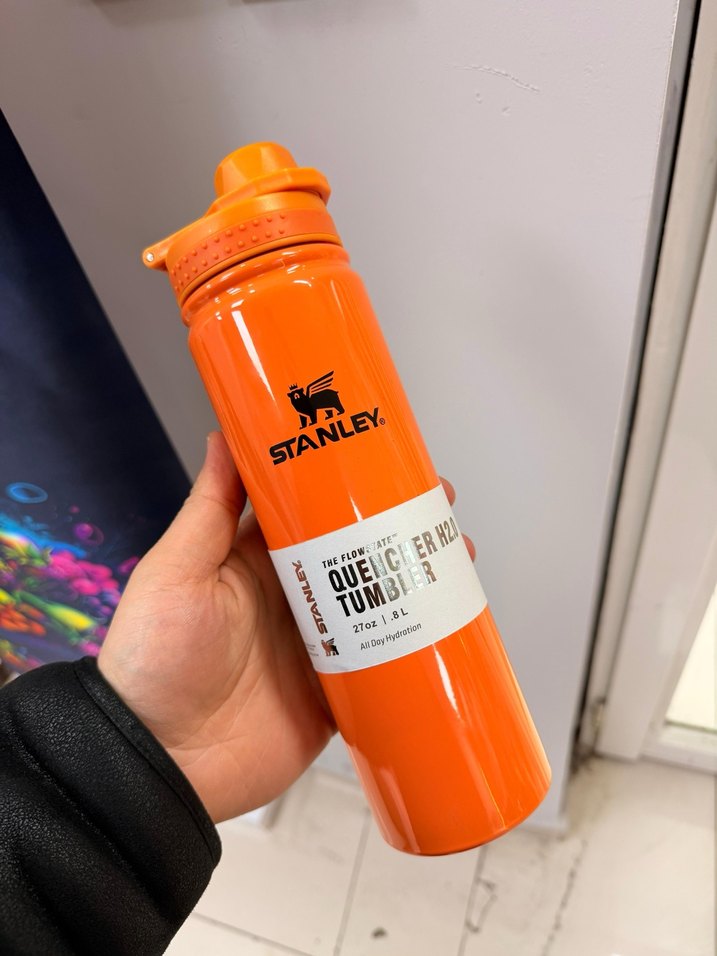 Stanley markalı, renkli turuncu termos şişesi 270 ml hacminde olup içecekleri sıcak veya soğuk tutar. Güvenli kapaklıdır.
