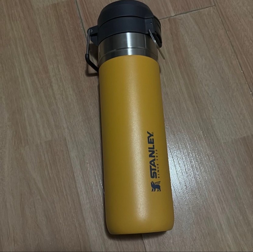 Stanley markalı sarı termos, sağlam kapak ve dayanıklı yapıya sahiptir, içecekleri sıcak veya soğuk tutar.