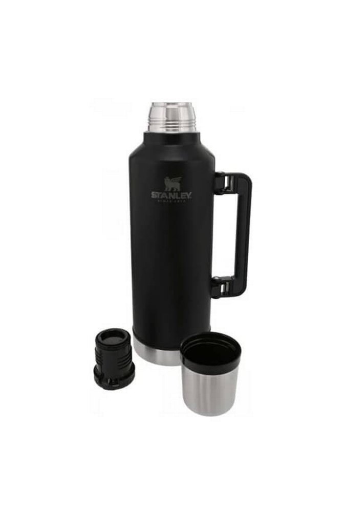 Stanley siyah termos, sağlam tutma sapı, vidalı kapak ve içme kabı ile birlikte gelir. Sıcak içecekleri uzun süre korur.