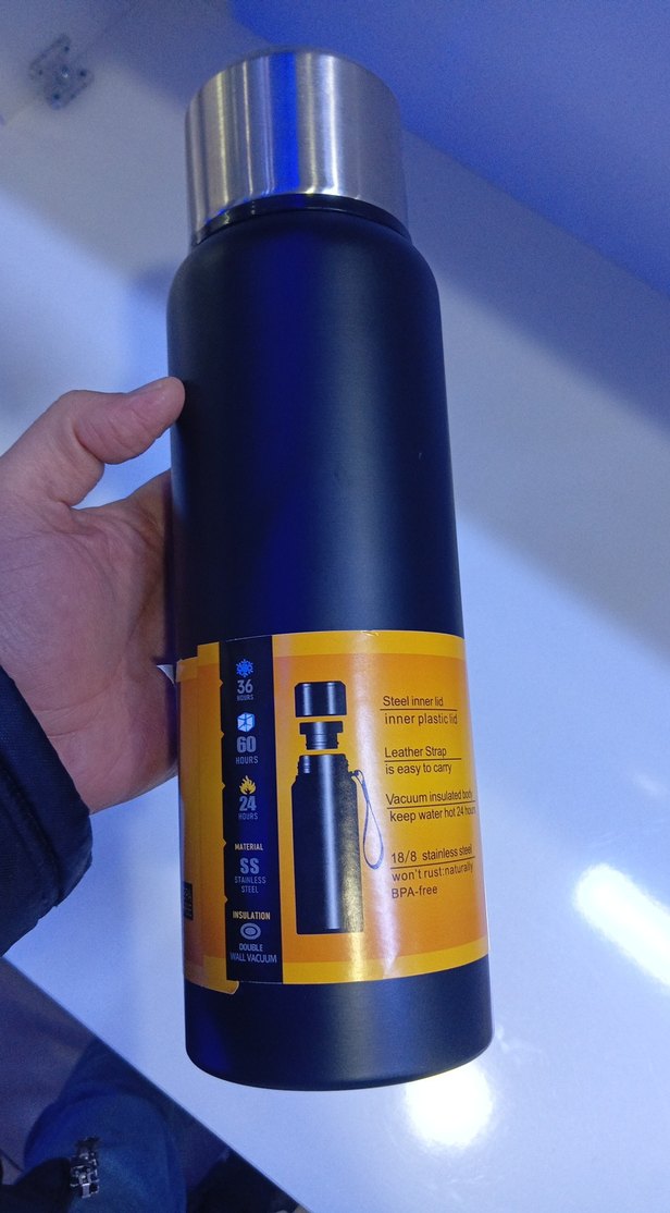 Siyah termos şişe, içi çelik ve plastik kaplamalıdır. Taşıma için deri kayış bulunur. Vakum izolasyonu sayesinde içecekleri uzun süre sıcak veya soğuk tutar. Paslanmaz çelik ve BPA içermez.