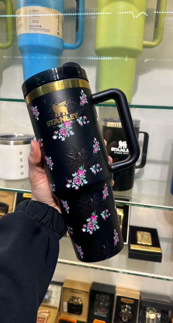 Stanley siyah termos bardak, çiçek desenleri ve sağlam kulplu, içecekleri sıcak tutar.