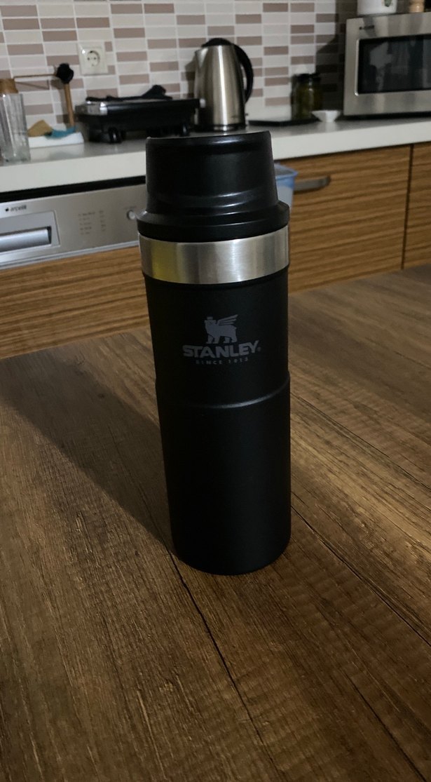 Stanley siyah termos, dayanıklı yapısı, güvenli kapağı ve paslanmaz çelik halkasıyla içecekleri sıcak veya soğuk tutar.