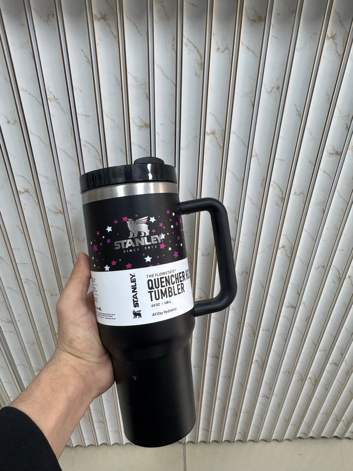 Uzun süre sıcak veya soğuk tutan, kulplu siyah Stanley termos bardak. Dayanıklı ve kullanışlıdır.
