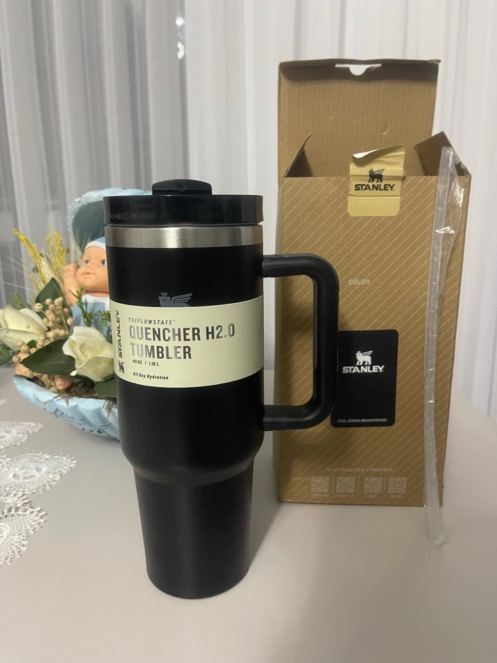 Stanley Quencher H2.0 siyah termos kupa, sağlam kulp ve dökülmeyi önleyen kapaklıdır. Uzun süre sıcak veya soğuk tutar. Orijinal kutusu ve pipeti vardır. Orjinal lisanslı