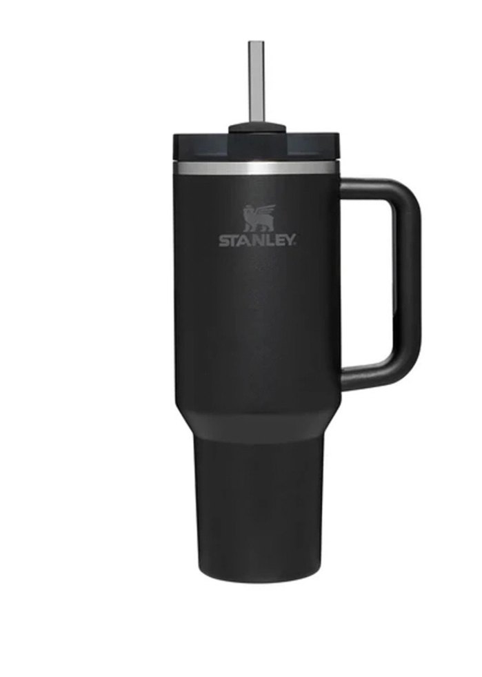 Stanley marka siyah termos bardak, saplı ve pipetli, içecekleri uzun süre sıcak veya soğuk tutar. Dayanıklı ve kullanışlıdır.