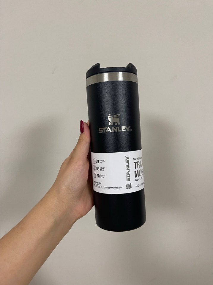 Stanley siyah termos matara, 354 ml kapasiteye sahiptir ve içecekleri saatlerce sıcak veya soğuk tutar. Dayanıklı koyu renklidir ve güvenli kapaklıdır.