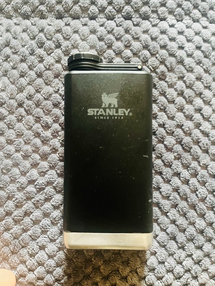 Stanley siyah termos matara, sağlam yapısı ve güvenli vidalı kapağı ile içecekleri sıcak veya soğuk tutar. Marka logosu ön taraftadır.