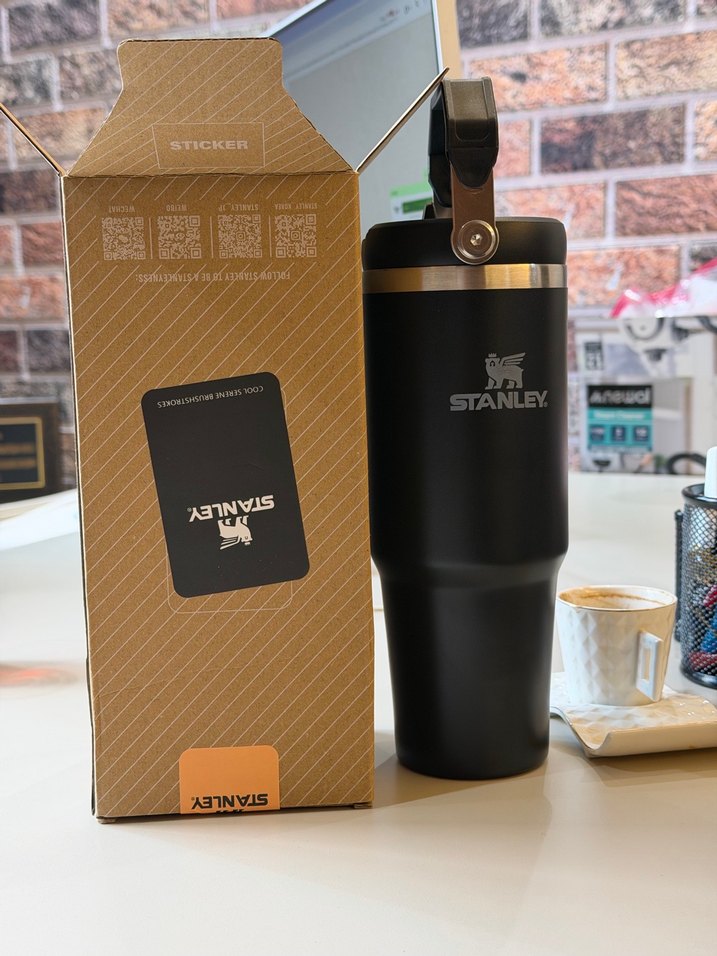 Stanley siyah termos matara, sağlam kapaklı ve içecekleri sıcak veya soğuk tutar. Dayanıklı ve taşınması kolaydır.