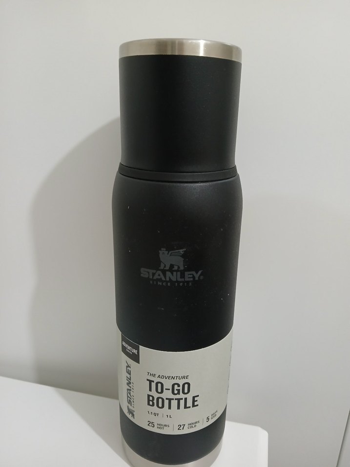 Stanley markalı siyah termos şişe, 1 litre kapasite ile sıcak veya soğuk içecekleri korur. Dayanıklı ve taşınabilir yapıda.