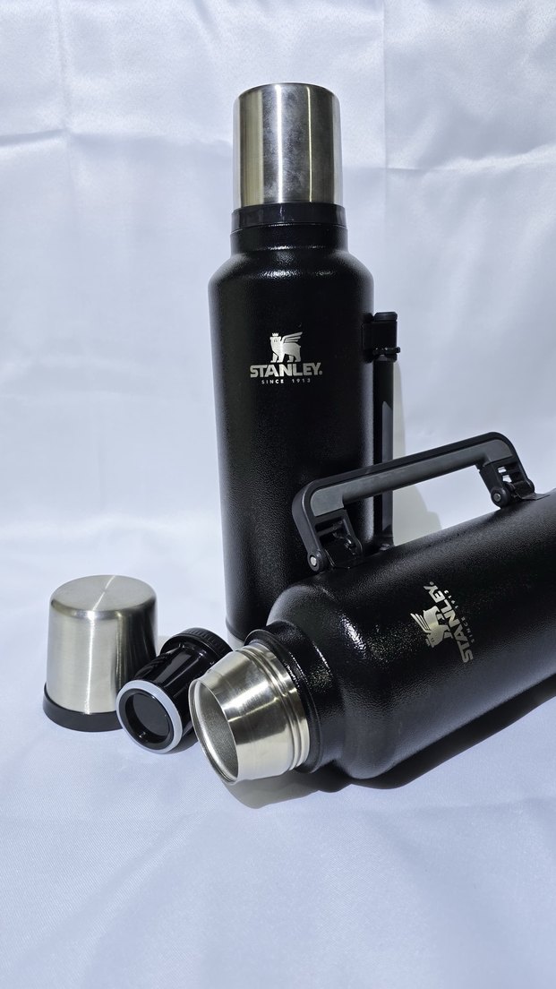 Stanley siyah termos şişe, sağlam kulplu ve paslanmaz çelik bardaklıdır. İçecekleri uzun süre sıcak tutar. 48 sıcak 48 soğuk