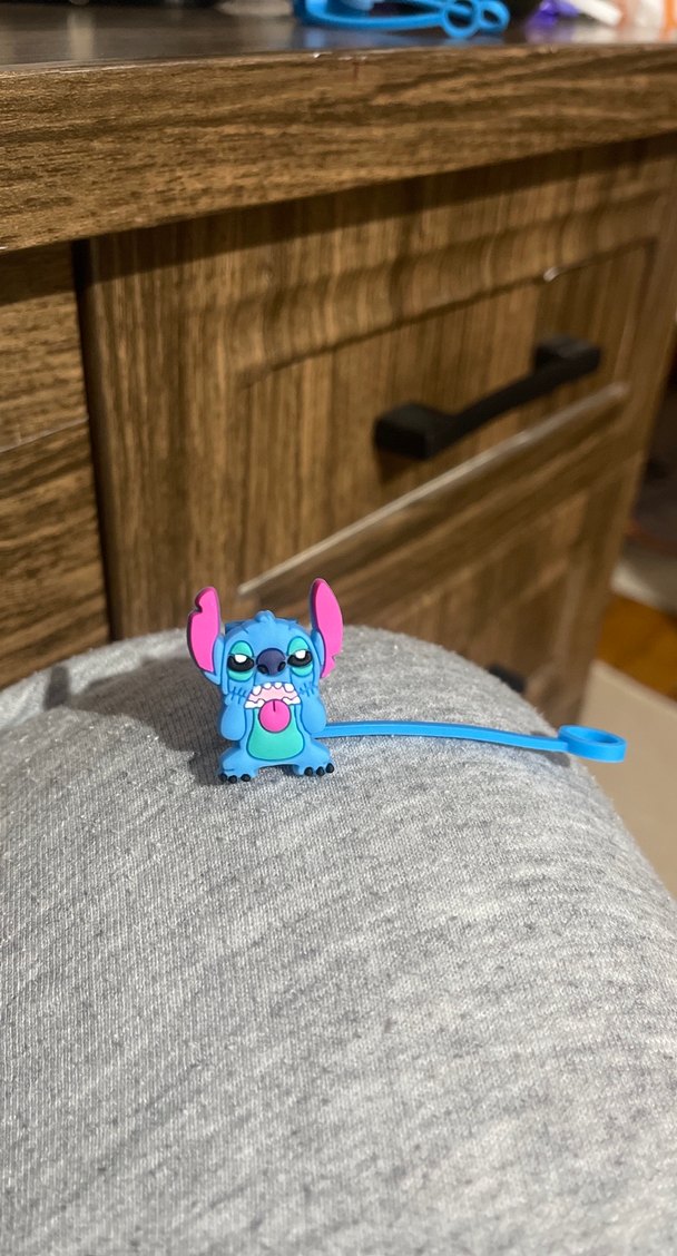 Canlı renklerde, Stitch karakterli küçük gri aksiyon figürü, oyuncu pozda stanley pipeti